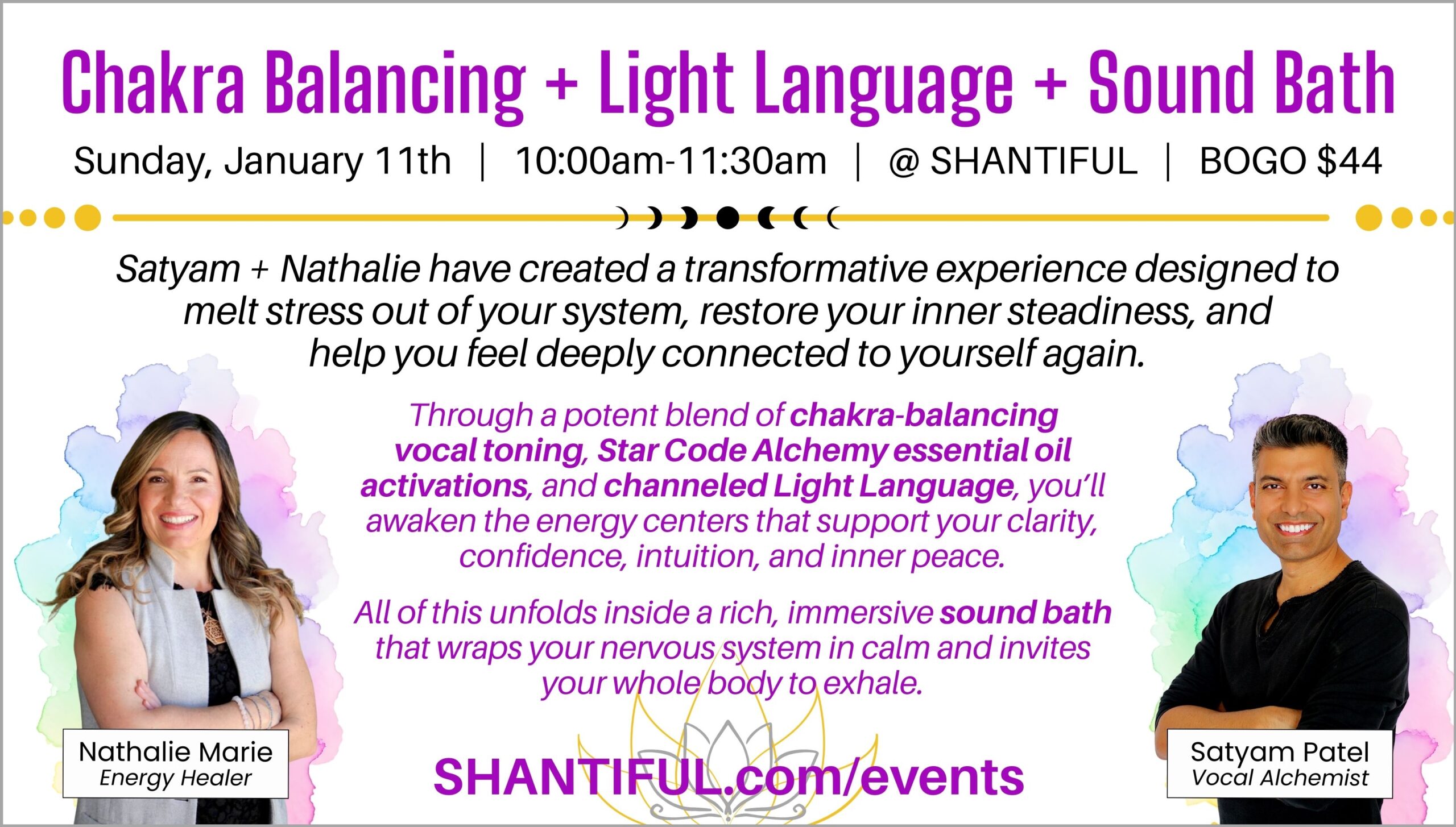 10:00am-11:30am | BOGO $44 | Hosted by Satyam Patel of Sounds of Satyam + Nathalie Rivett of Stress Free Vibes